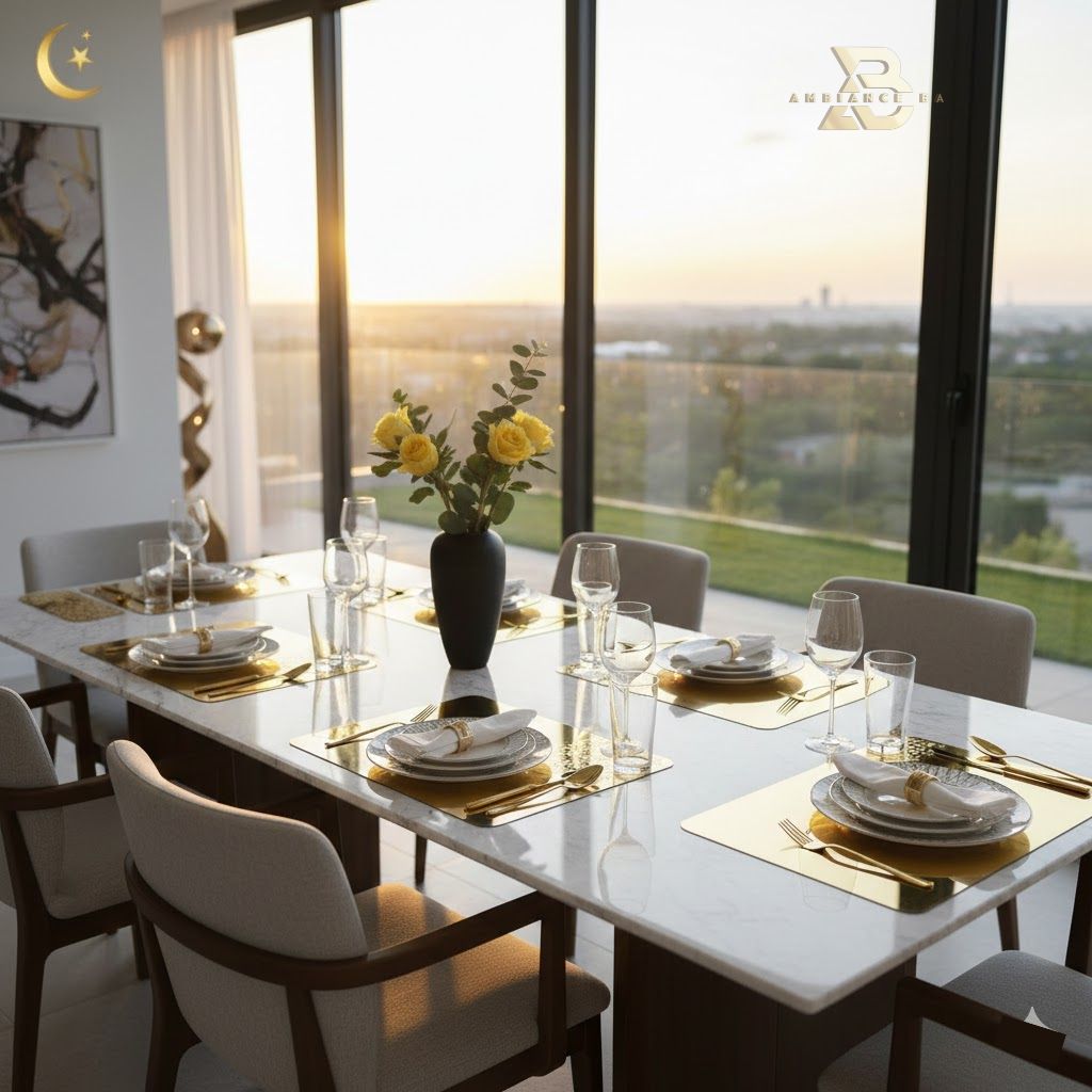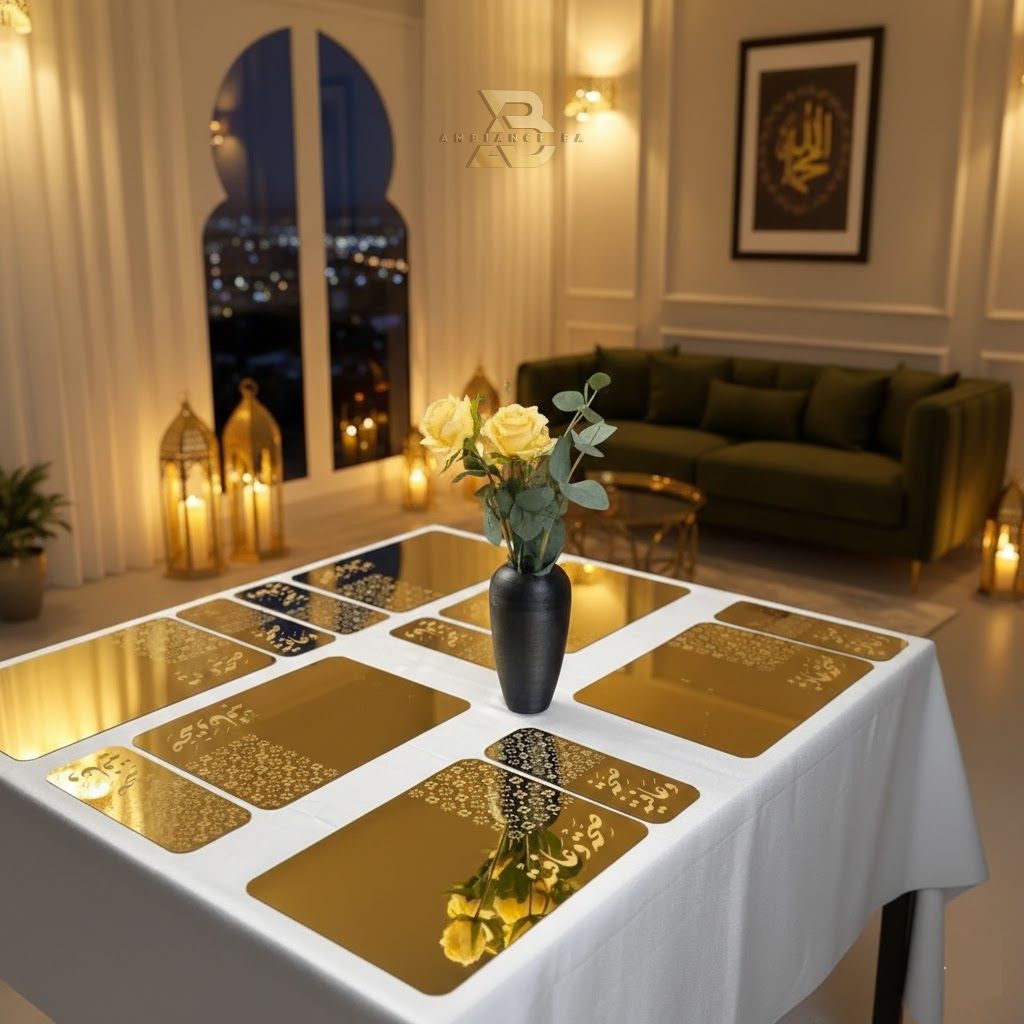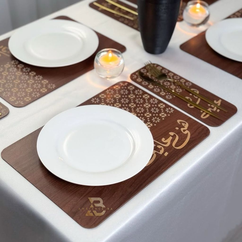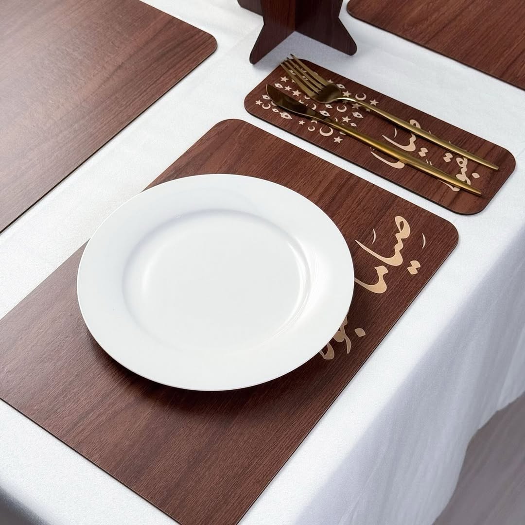 مفارش طاولة فاخرة – مزيج الخشب الطبيعي والذهب الأنيق